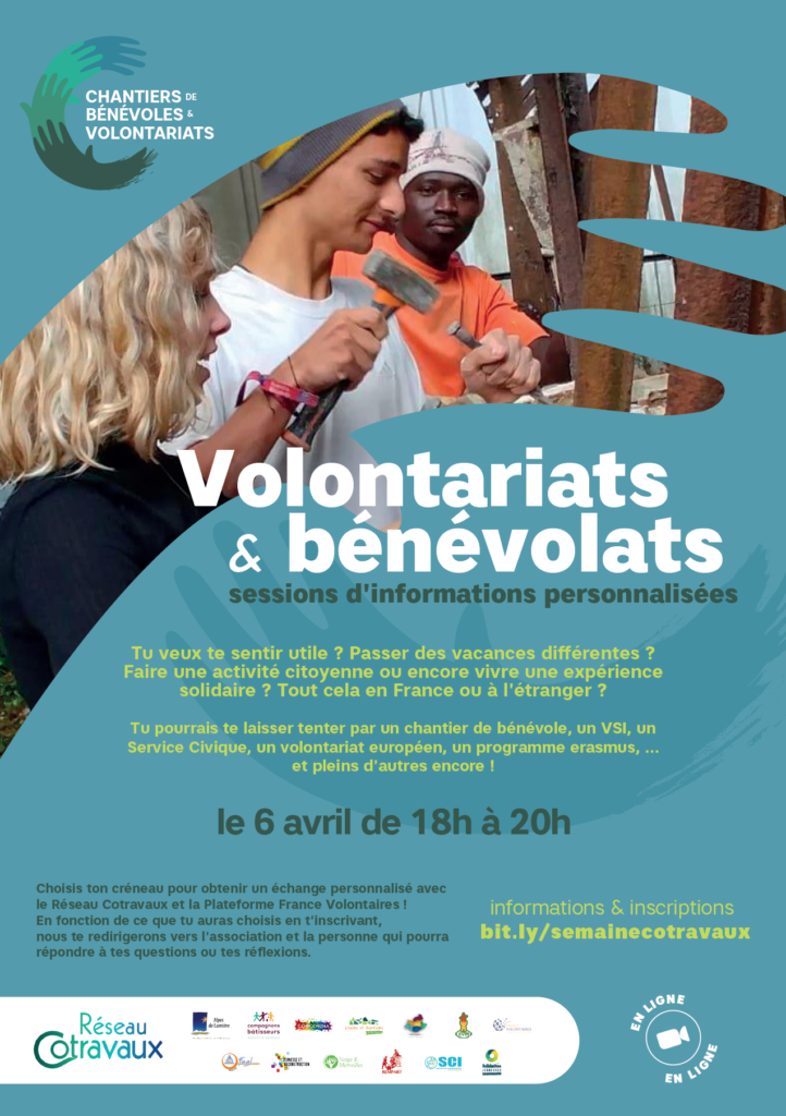 Le réseau Cotravaux vous invite à son événement d’information à destination du grand public. Sous forme de sessions personnalisées, vous pourrez vous entretenir sur les sujets volontariat, bénévolat, chantiers internationaux, Service Civique (etc) avec des associations du réseaux Cotravaux et la plateforme France Volontaires.
